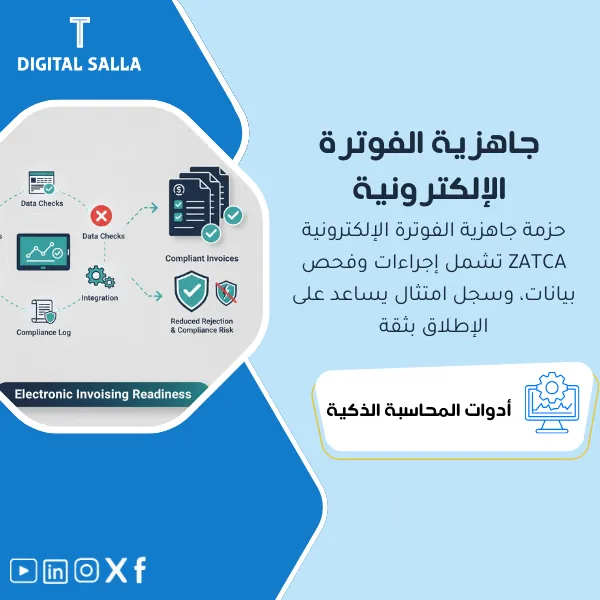 ستستلم: SOP + Data Dictionary + Validation Checklists + Errors Log + Compliance Log + Samples Tracker + Pack Index لتجهيز ZATCA e-invoicing readiness كحزمة موثقة قابلة للتحديث والأرشفة.
